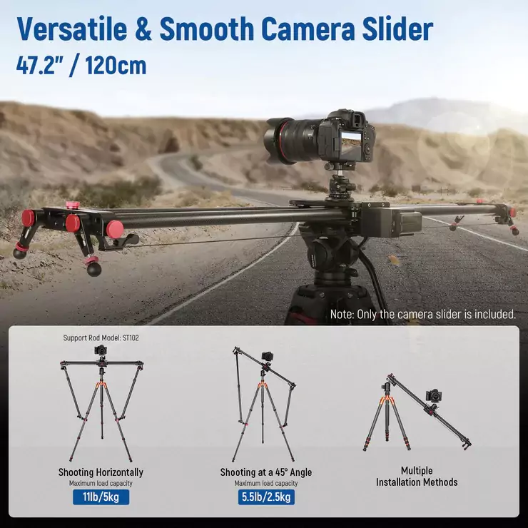 ظرفیت بار این اسلایدر 11 پوند (5 کیلوگرم) زمانی که به صورت افقی قرار دارد و 5.5 پوند (2.5 کیلوگرم) زمانی که به صورت زاویهدار 45 درجه نصب شود. طول اسلایدر 120 سانتیمتر است که میتوانید آن را در فواصل طولانی برای حرکتهای دقیق استفاده کنید. این اسلایدر به همراه کنترل از راه دور RT-08، باتری جایگزین NP-F550، شارژر USB و چندین کابل شاتر برای دوربینهای مختلف به بازار عرضه میشود. به لطف این ویژگیها، این اسلایدر برای استفاده در پروژههای پیچیده و طولانیمدت ایدهآل است.