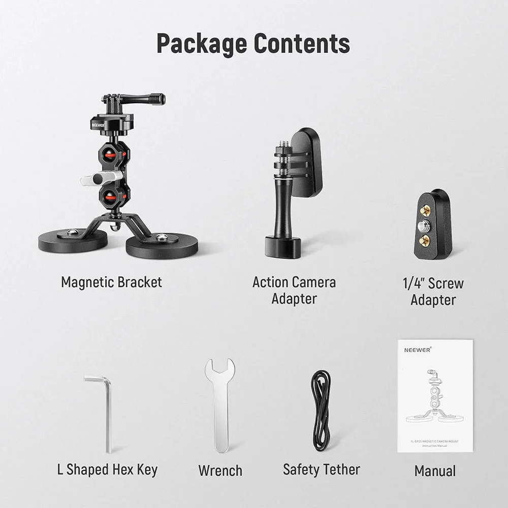 NEEWER FL-GP15 از ترکیب آلیاژ آلومینیوم، لاستیک سیلیکون و آهنربا ساخته شده است که باعث استحکام و دوام بالای آن میشود. این هولدر با وزن 498 گرم و ظرفیت بار 2 کیلوگرم میتواند به طور محکم به سطوح فلزی متصل شود. مکندههای مغناطیسی آن قادر به تحمل وزن تا 4.4 پوند (2 کیلوگرم) هستند و با داشتن نیروی کشش عمودی 22 پوند (10 کیلوگرم)، برای استفاده در شرایط مختلف بسیار مناسب است. علاوه بر این، این محصول به همراه آداپتور نصب دوربین اکشن، آداپتور پیچ 1/4 اینچی، آچار شش گوش و تسمه ایمنی ارائه میشود.