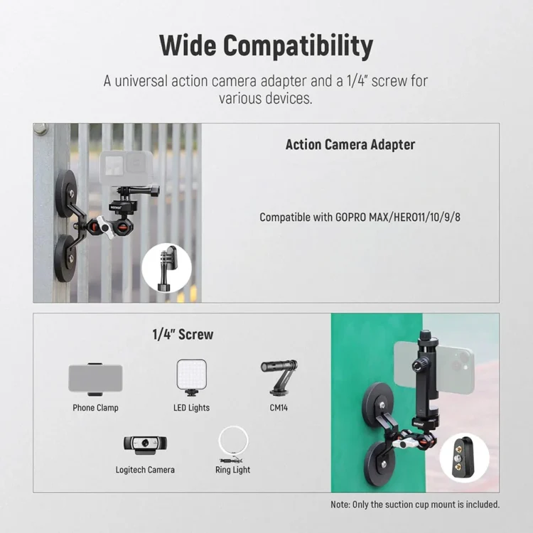 پیش از خرید هولدر با مانت اکشن کمرا نیور Neewer، باید از سازگاری دوربین خود با آداپتورهای موجود اطمینان حاصل کنید.این محصول برای نصب روی سطوح فلزی مانند کاپوت، سقف یا در خودرو طراحی شده است. اگر قصد استفاده در محیطهای غیر فلزی دارید، باید محل مناسبی برای نصب پیدا کنید. همچنین، این هولدر بهترین عملکرد را برای دوربینهای اکشن با وزن کمتر از 2 کیلوگرم دارد و استفاده از آن برای دوربینهای سنگینتر ممکن است خطرناک باشد.