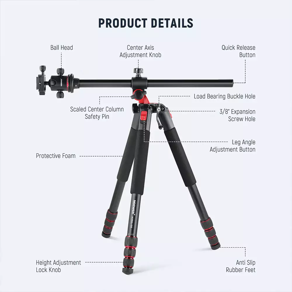 طول ستون مرکزی این سه پایه 48 سانتیمتر است که برای تنظیم ارتفاع و استفاده در موقعیتهای مختلف کاربردی است.