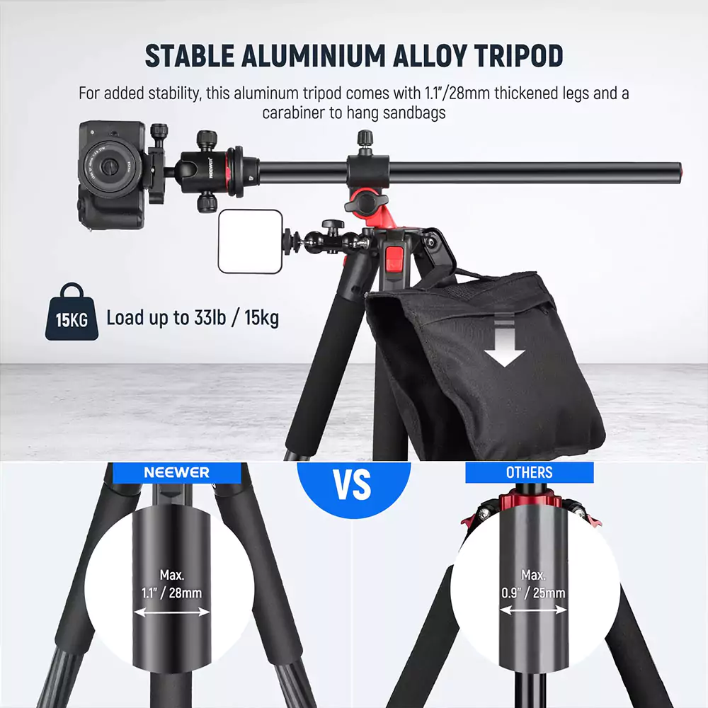 سه پایه دوربین نیور NEEWER N284L+G0 از آلیاژ آلومینیوم منیزیم ساخته شده است که ترکیب این دو فلز، سبک بودن و استحکام بالای سه پایه را فراهم میآورد. این پایه دوربین توانایی تحمل وزن تا 15 کیلوگرم را دارد که آن را برای دوربینهای حرفهای و تجهیزات سنگینتر مناسب میسازد.