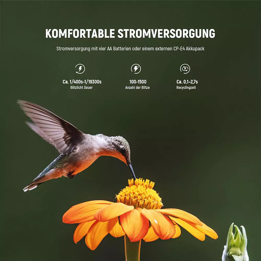 | سایر مشخصات | | حداکثر توان | 76 وات | | سازگاری با | دوربینهای Canon | | تعداد و حالات فلاش | 3 (TTL / M / Multi) | | زمان شارژ مجدد | 0.1 تا 2.7 ثانیه | | تعداد فلاش | 100 تا 1500 بار | | پشتیبانی از باتری خارجی | بله؛ CP-E4 |