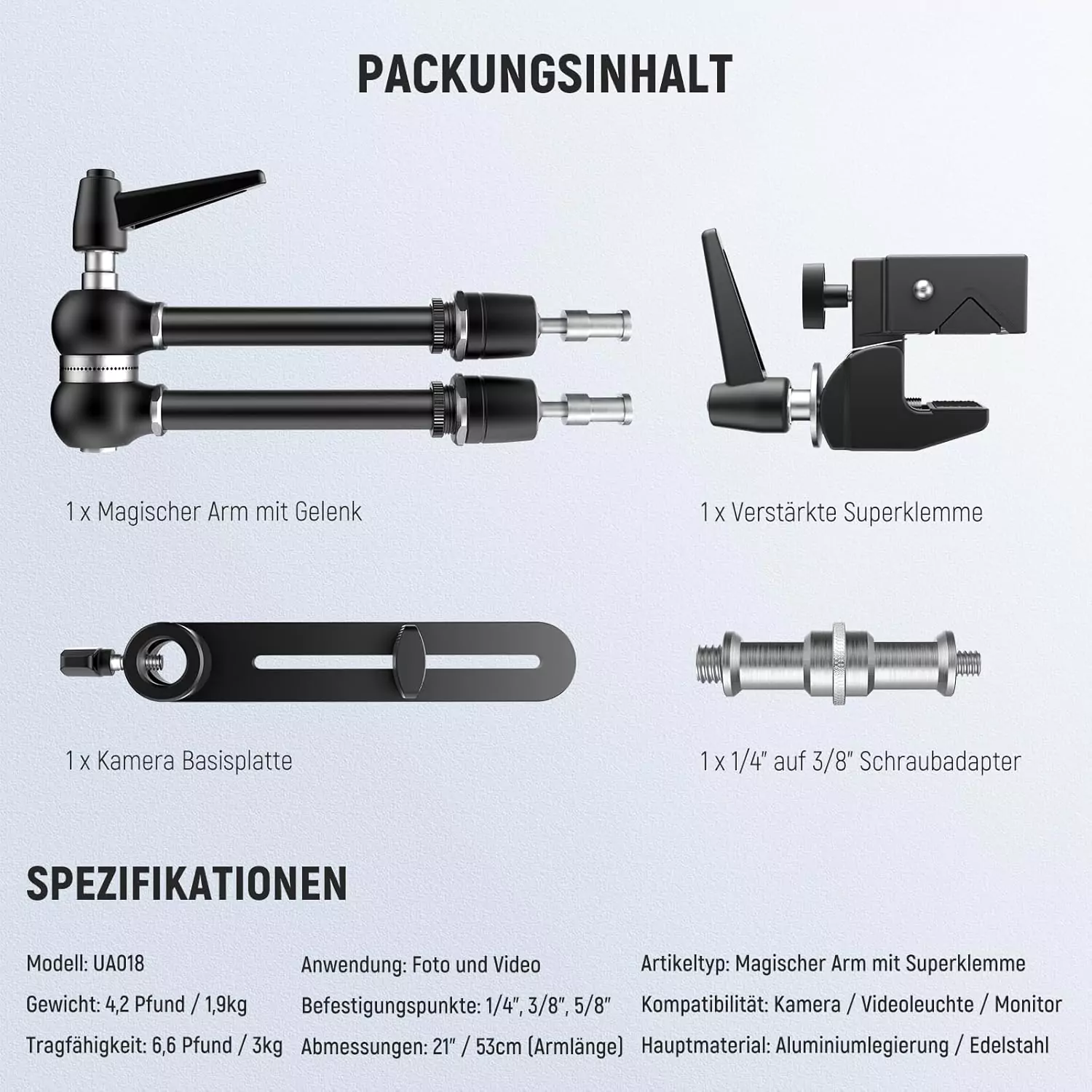 - اقلام همراه: یک عدد بازوی جادویی مفصلی/یک عدد گیره فوق العاده تقویت شده/یک عدد/آداپتور پیچ ۱/۴ اینچ به ۳/۸ اینچ/یک عدد صفحه نصب