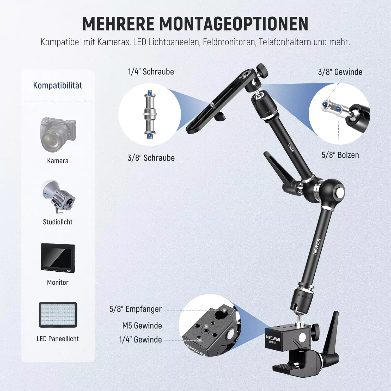 - قابل استفاده برای دوربین DSLR، نور LED، مانیتور، موبایل، GoPro و وبکم