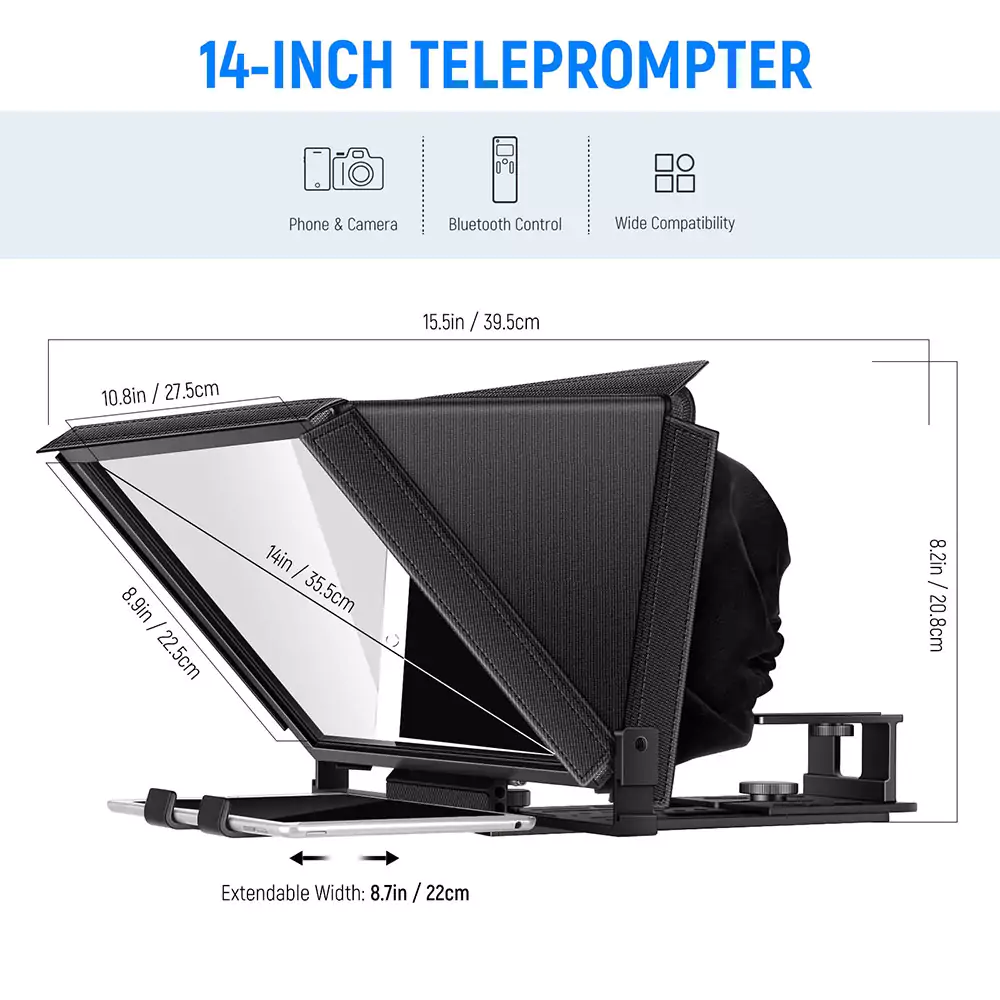 - ابعاد سازگار برای دستگاههای مختلف: این تله پرامپتر برای دستگاههایی مانند iPad و تلفن همراه با عرض 9.84 x 8.68 اینچ (25cm x 22cm) مناسب است.