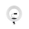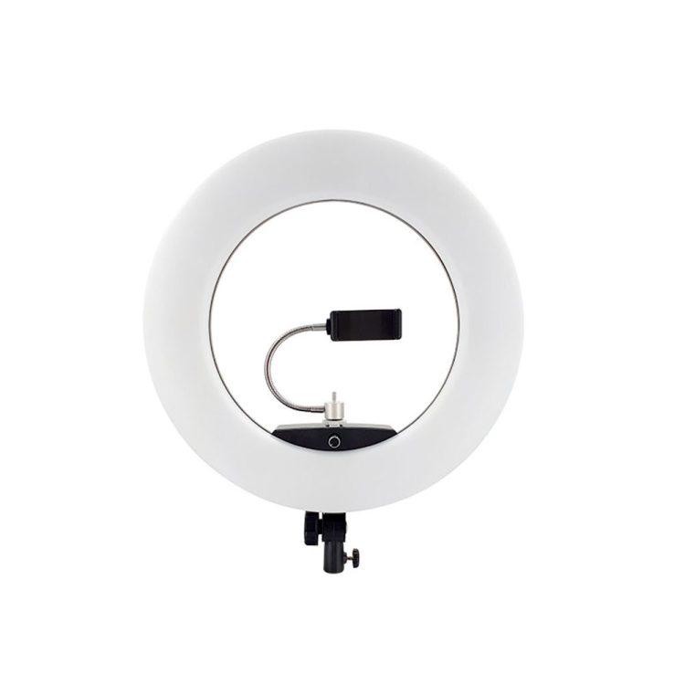یکی از معایب این رینگلایت عدم وجود ریموت کنترل است که شاید برای برخی از کاربران این موضوع چندان خوشایند نباشد. پشت بدنه علاوه بر پورت برق، از پورت USB 2.0 5 ولتی با شدت جریان 2 آمپر برخوردار است. میتوانید گوشی هوشمند یا تبلت خود را در حین کار شارژ کنید. وجود یک صفحه نمایش LCD کار شما را برای مشاهده تنظیمات راحت میکند. تنظیمات نور از جمله شدت و دمای رنگ را با دقت مشاهده کنید. اگر نیاز به همگام شدن با دیگر منابع نوری باشد اعداد دقیق به شما کمک میکنند تا به صورت حرفهای نورپردازی کنید.