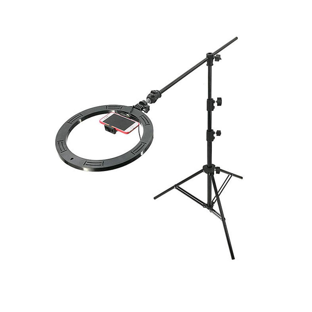 رینگ لایت FC-1674 به یک سه پایه مجهز شده است تا از خریدهای اضافی جلوگیری شود. شما میتوانید این سه پایه را روی سطوح مختلف قرار داده و ارتفاعش را نیز تغییر دهید. میله افقی که به همراه این سه پایه عرضه میگردد را میتوان یکی از مهمترین مزایای آن محسوب نمود. این میله پایههای ساده را به سه پایه T تبدیل میکند و به شما کمک میکند زوایای مختلف را پوشش دهید؛ برای عکاسی اشیا از پلان بالا، به خصوص عکاسی از غذا بسیار کاربردی میباشد.