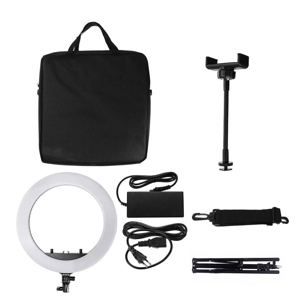 این سه پایه از 112 لامپ قدرتمند تشکیل شده است. شما میتوانید درجه نور را در حالتهای متنوع تنظیم کنید. علاوه بر آن، قادر خواهید بود با انتخاب دمای رنگی از محدوده 3200 تا 5600 کلوین، روشنایی را از سطح کاملاً آفتابی به کاملاً مهتابی تغییر دهید. عمر مفید لامپهای رینگ لایت HQ-450 برابر 300000 است. زاویه نوردهی نیز همانطور که از یک رینگ لایت حرفهای توقع میرود، 360 درجه است. یک دیمر برای سطح روشنایی و یک دیمر برای دمای رنگی در نظر گرفته شده است. توان این رینگ لایت برابر 55W است و با برق AC100-240 و فرکانس 60/50 کار میکند.