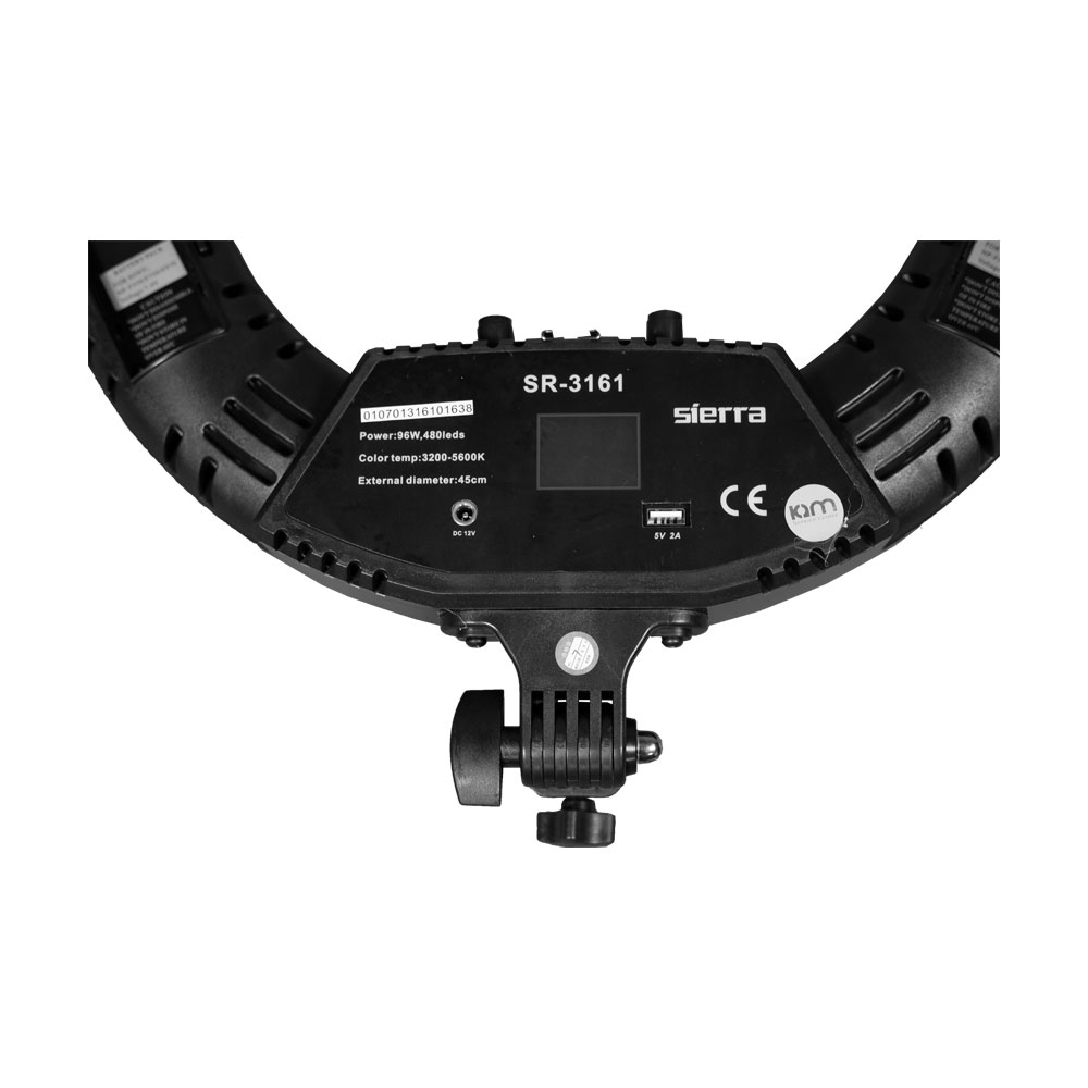 این محصول با بدنه مشکی تولید شده و به پورت USB نیز مجهز است. دارای قطر خارجی 45 سانتیمتر و قطر داخلی 32 سانتیمتر است. این رینگ لایت به یک نمایشگر دیجیتال مجهز است و دارای پیچ دمای رنگی با قابلیت تنظیم بین 3200 تا 5600 درجه کلوین است. حلقوی بودن این محصول سبب میشود تا شما به راحتی با قرار دادن دوربین و یا تلفن همراه خودتان در وسط آن، منبع نور خود را در اطراف لنز قرار داده و نور را به بهترین شکل ممکن پخش کنید. قابلیت سوار شدن آینه و تلفن همراه و دوربین را بر روی خود دارد و به راحتی بر روی سه پایه قرار گرفته و تنظیم میشود. این محصول به شما این امکان را میدهد تا یا به صورت اتصال به برق مستقیم و یا با استفاده از باتری به تنظیم نور خود و عکاسی با این رینگ لایت بپردازید.