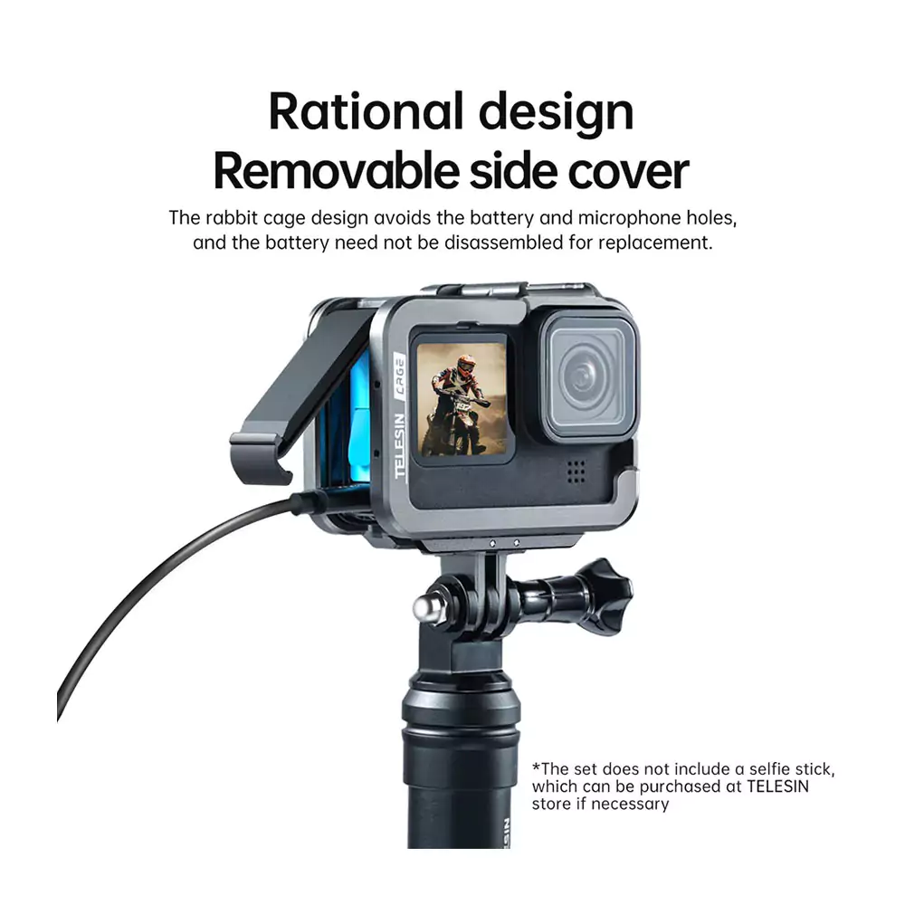 کیج فلزی تلسین با استفاده از پردازش دقیق CNC طراحی شده تا دسترسی کاملی به پورتها، دکمهها و محفظه باتری داشته باشید. محفظه جانبی آن بهطور دقیق با محفظه باتری هماهنگ است و به شما این امکان را میدهد که به راحتی باتری و کارت SD دوربین را تعویض کنید.