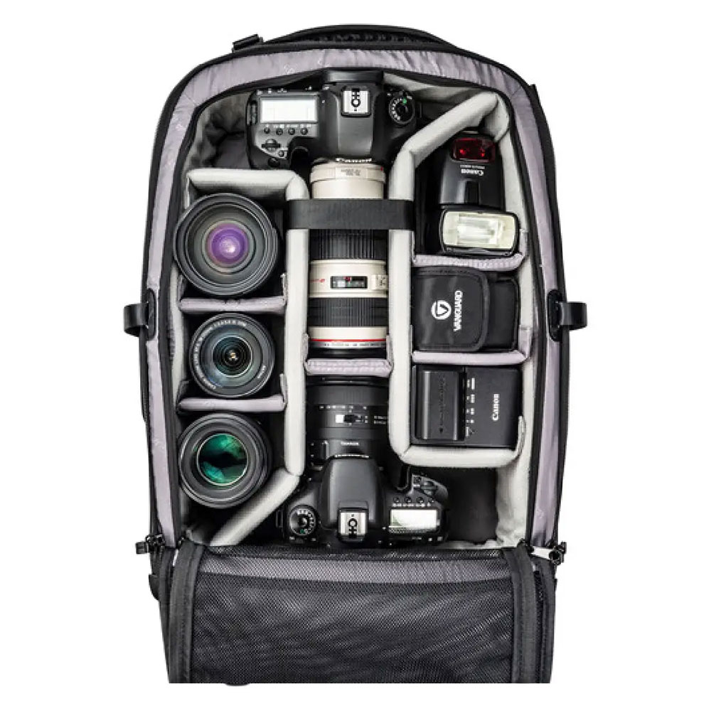 کوله پشتی دوربین ونگارد VEO SEIECT 55BT BK برای سهولت در حمل تجهیزات حساس عکاسی طراحی شده است. فضای موجود در این کوله پشتی برای قرار دادن یک یا دو دوربین DSLR، 4 تا 5 لنز اضافی به همراه فلاش و یک دوربین به همراه لنز 300 میلیمتری مناسب است. در ضمن همانطور که پیشتر به آن اشاره شد، یک فضای اختصاصی برای قرارگیری تبلت و لپ تاپ درون کوله پشتی تعبیه شده است که برای قرار دادن لپ تاپهای تا سایز 13 اینچ و تبلتهایی تا سایز 9.7 اینچ مناسب میباشد. وجود نگهدارنده سه پایه نیز سبب میشود تا عکاس تقریبا تمامی تجهیزات مد نظر خود را بتواند به همراه داشته باشد. داشتن کاور باران از یک سمت و مقاومت بالای برزنت به کار رفته در دوخت کوله پشتی از سمت دیگر امکان استفاده از این محصول در هر شرایط آب و هوایی را فراهم میکند. چهار چرخ تعبیه شده در زیر کوله پشتی نیز منجر به حمل آسان آن میشود.