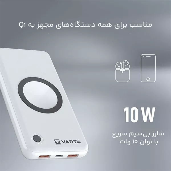 • از جمله مهم‌ترین مزیت‌های این گجت داشتن ظرفیت مناسب برای استفاده در مسافرت‌های طولانی و حتی شارژ حین حرکت است. البته پاوربانک وایرلس وارتا در در سه ظرفیت 5000، 10000، 15000 و 20000 به بازار عرضه می‌‌شود.