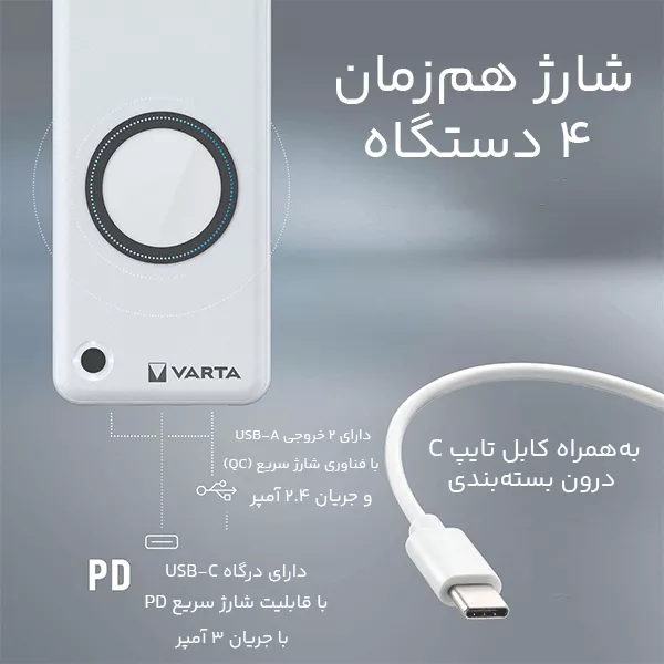 • برای سریع‌تر کردن روند شارژدهی پیشنهاد می‌شود از کابل‌های با کیفیت USB-C و USB وارتا استفاده کنید.