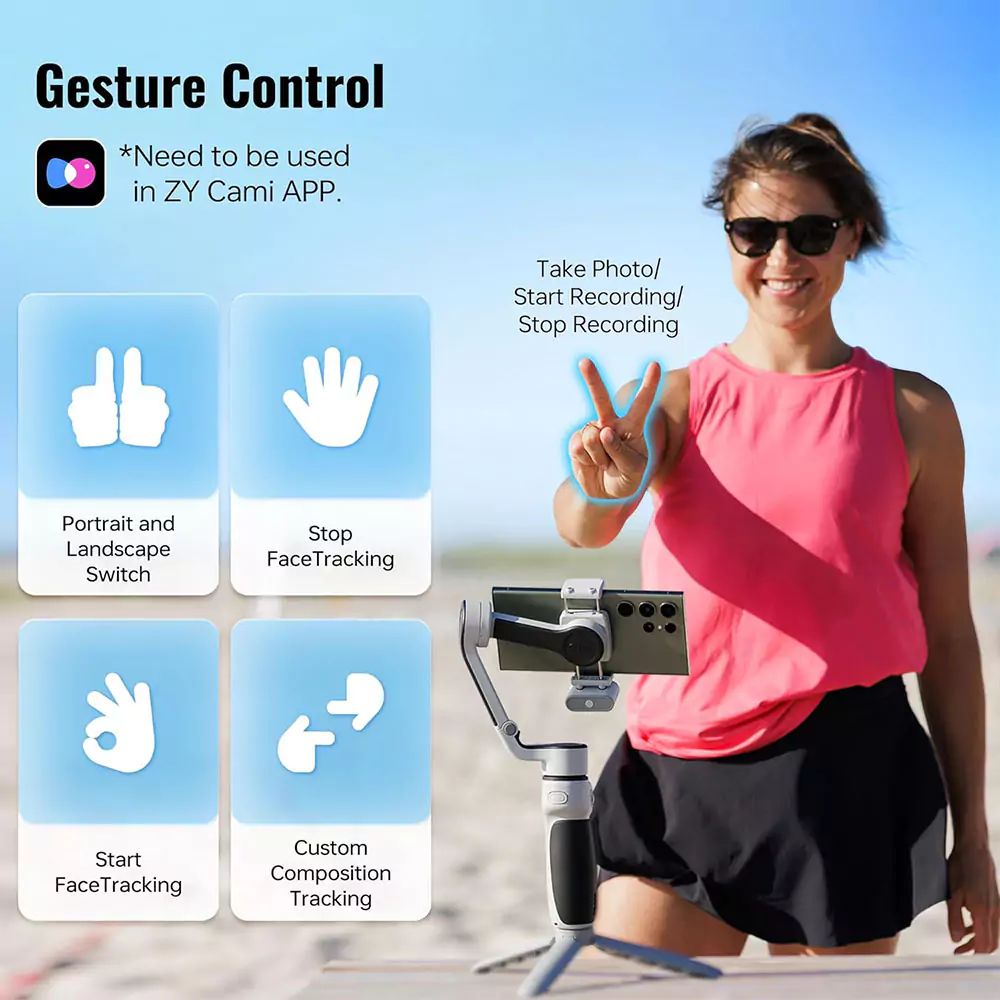 از جمله ویژگیهای وسوسهکننده Zhiyun CINEPEER CQ5 نسخه کمبو میتوان به پشتیبانی از دستیار صوتی اشاره کرد که تنها با گفتن عبارت Hey Cami فعال میگردد. پس از آن به سهولت میتوان به شکل گفتاری گیمبال را کنترل کرد. این دستگاه دارای حداکثر تحمل وزن 280 گرم است. از این رو میتوان تمام مدلهای گوشی هوشمند را به شکل عمودی و افقی همراه با آن استفاده کرد. ارتباط گوشی و گیمبال نیز از طریق بلوتوث نسخه 5.1 برقرار میگردد.